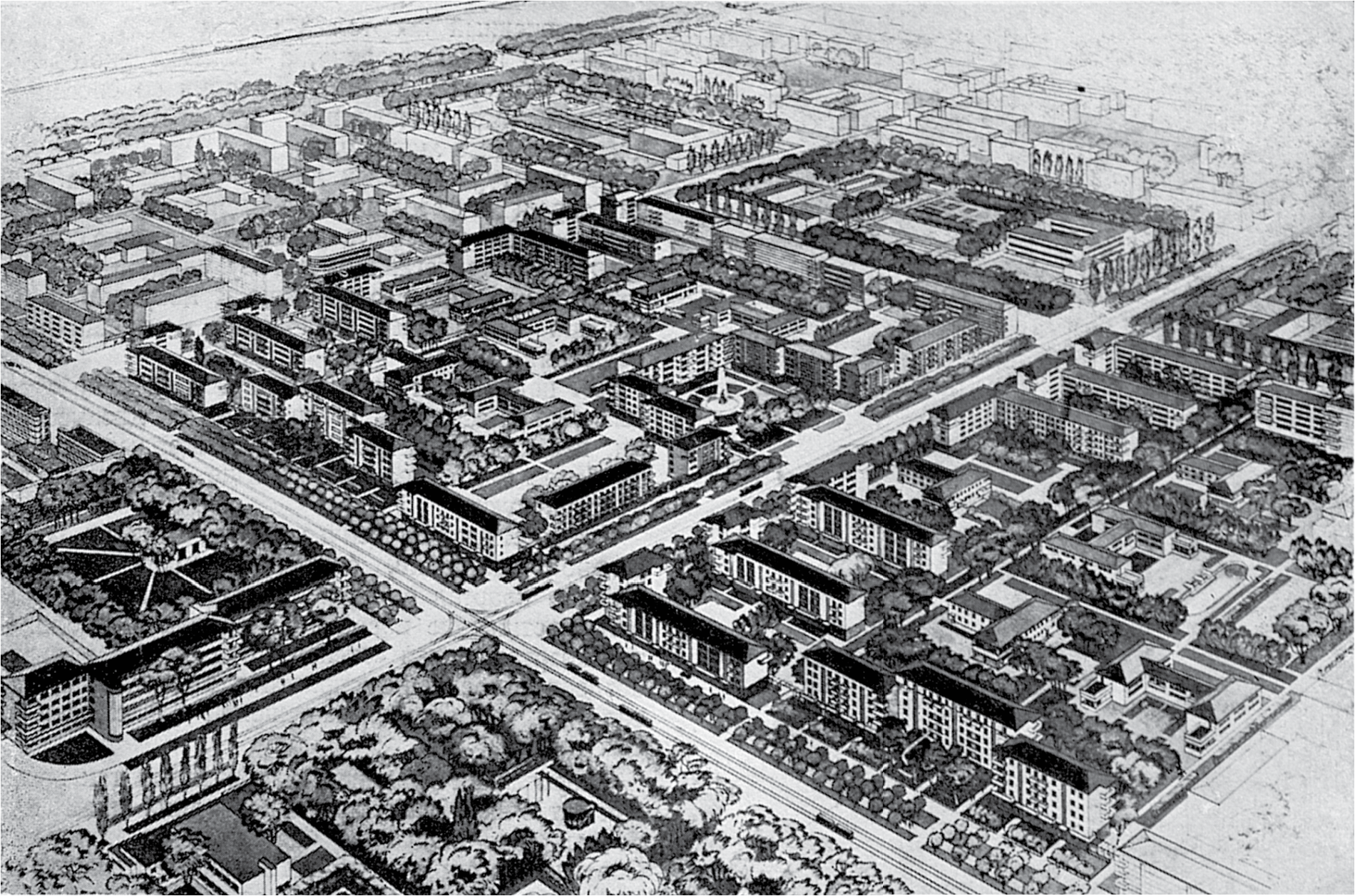 Le modèle peut être représenté par cette prise de vue qui montre bien l’urbanisme post-stalinien. On y observe le principe de microrayon, ainsi que la présence des espaces verts et des khrushchevka.